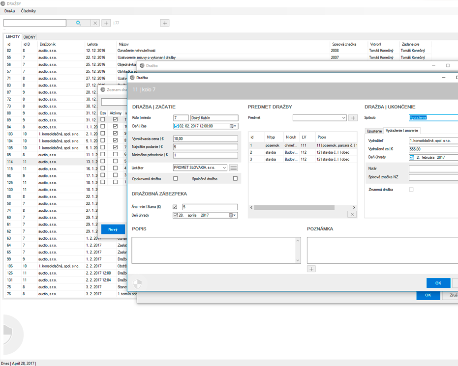 - Notifikácií a úloh, kde sa základné povinnosti a lehoty dražobníka generujú automaticky a chronologicky sa zobrazujú v úvodnom formulári aplikácie